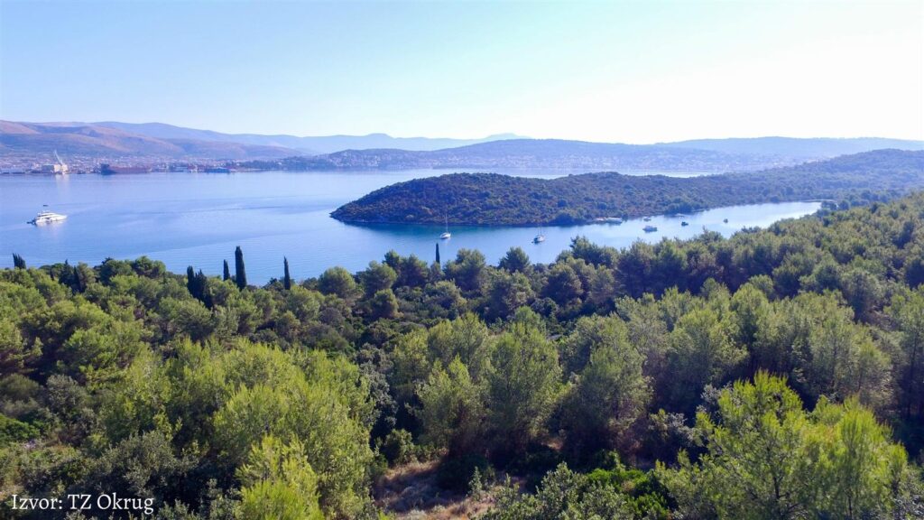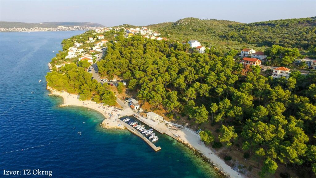 - En voiture : 25 minutes par la route côtière qui traverse Marina et Trogir. Traversez le pont et vous y êtes. Vous pouvez vous garer à la plage d’Okrug et près de Slatine.